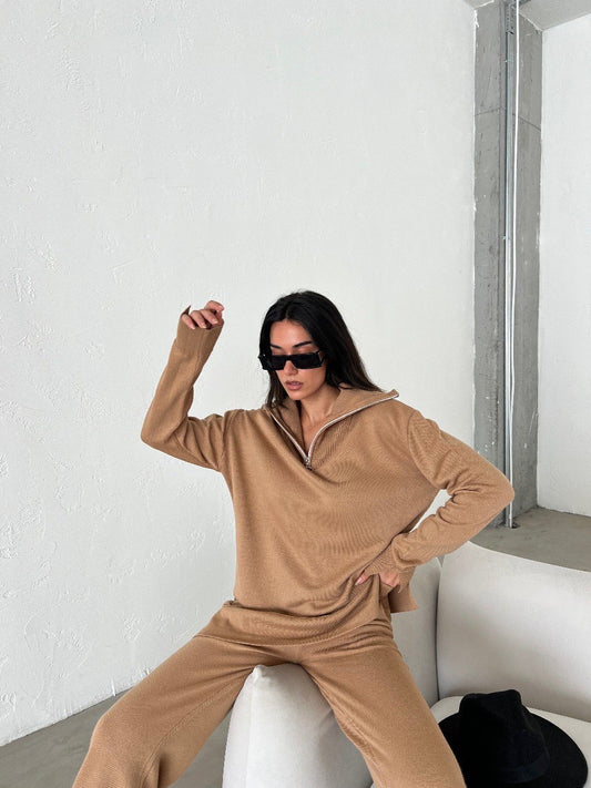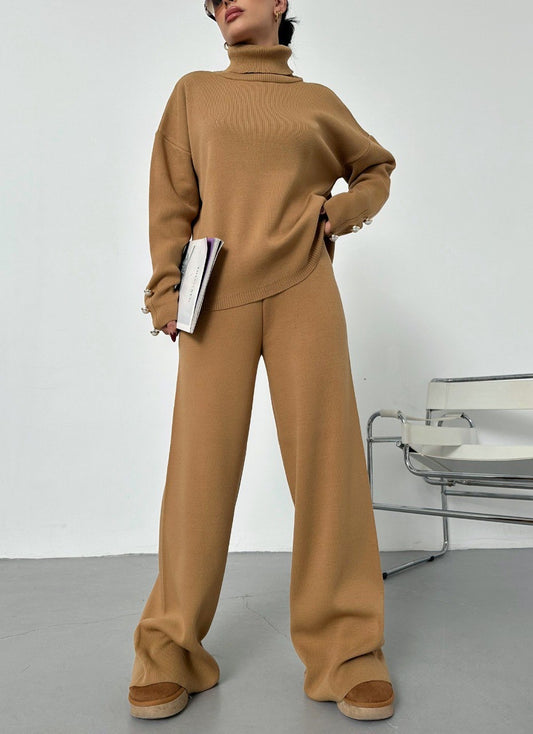 Button Detailed Camel Brown Sweater Knit Co-ord Set