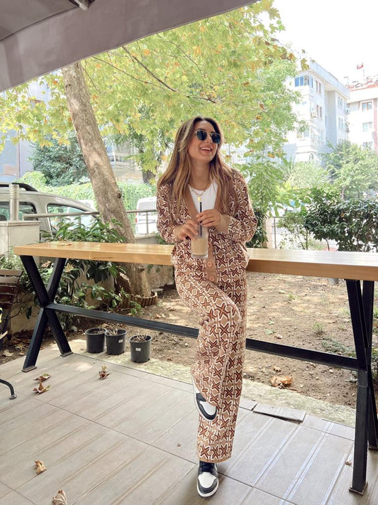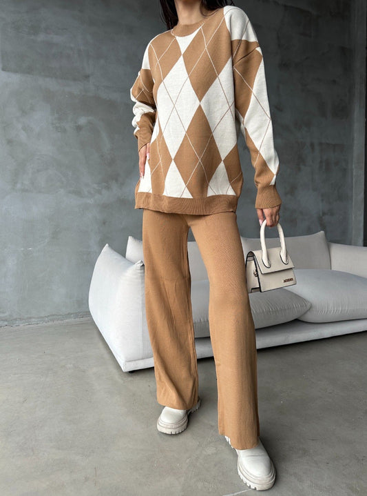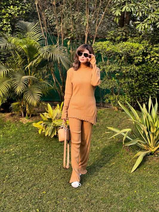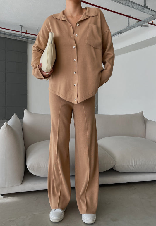 Button Detailed Camel Brown Sweater Knit Co-ord Set