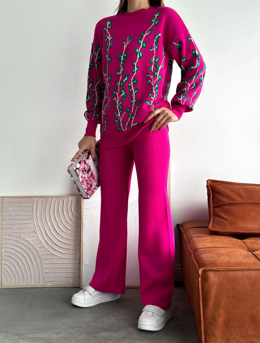 Crush Detailed Fuchsia Drop Shoulder Co-ord Set